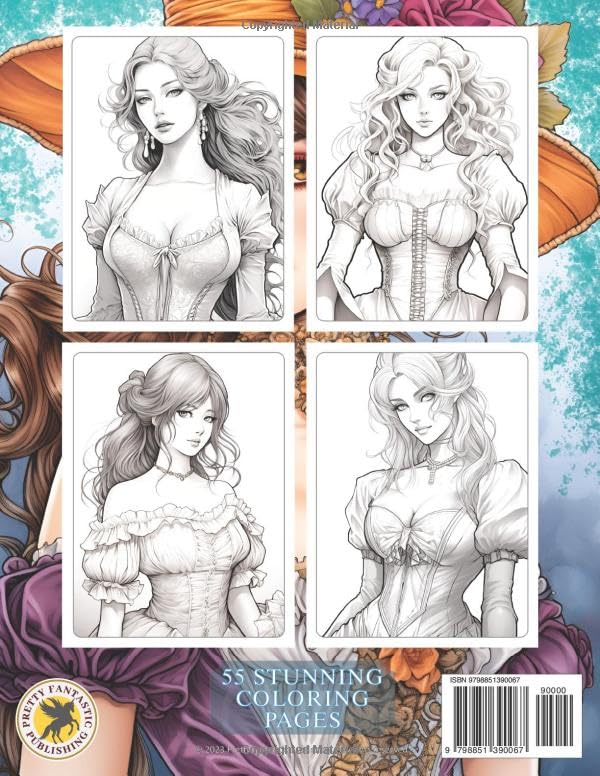 Celebrate the beauty & style of bygone eras as you breathe life into these stunning illustrations featuring gorgeous women adorned in vintage-style elegant dresses, Victorian gowns, and period costumes.