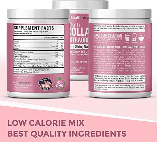 Hydrolyzed Collagen Peptides Powder With 5 Collagen Types – Our all natural hydrolyzed collagen protein peptides contain a professional grade bone broth blend of grass-fed beef bovine, free range chicken, marine wild-caught fish, and eggshell membrane collagen (including Type 1 & 2 peptides). Proudly made in the USA in a GMP Certified Facility, our hydrolysate collagen complex are 3rd party tested, Non-GMO, Gluten-Free, Keto friendly and Paleo friendly.