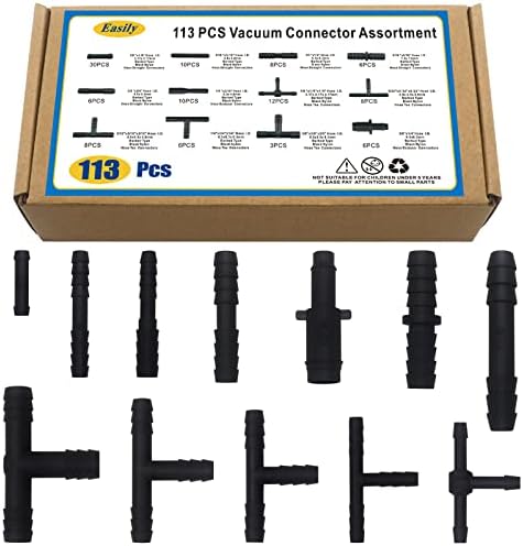 Vacuum Connector Assortment 113 PCS Heat Resistance 240℃(460℉)Automotive Vacuum Tubing Connector Vacuum Tee Connector Assortment Kit Black Nylon